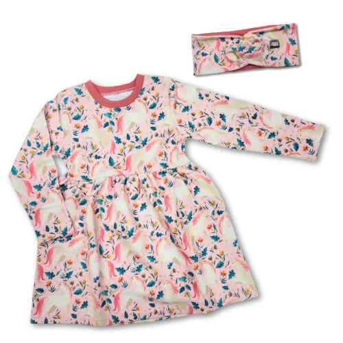 A szett egy prémium minőségű futter anyagból készült kislány ruhából és egy hozzá illő, rugalmas fülpántból áll – így egy komplett, praktikus és stílusos összeállítást kapsz.