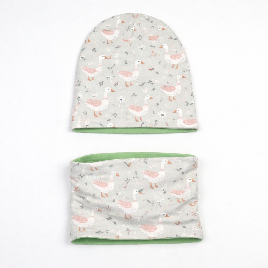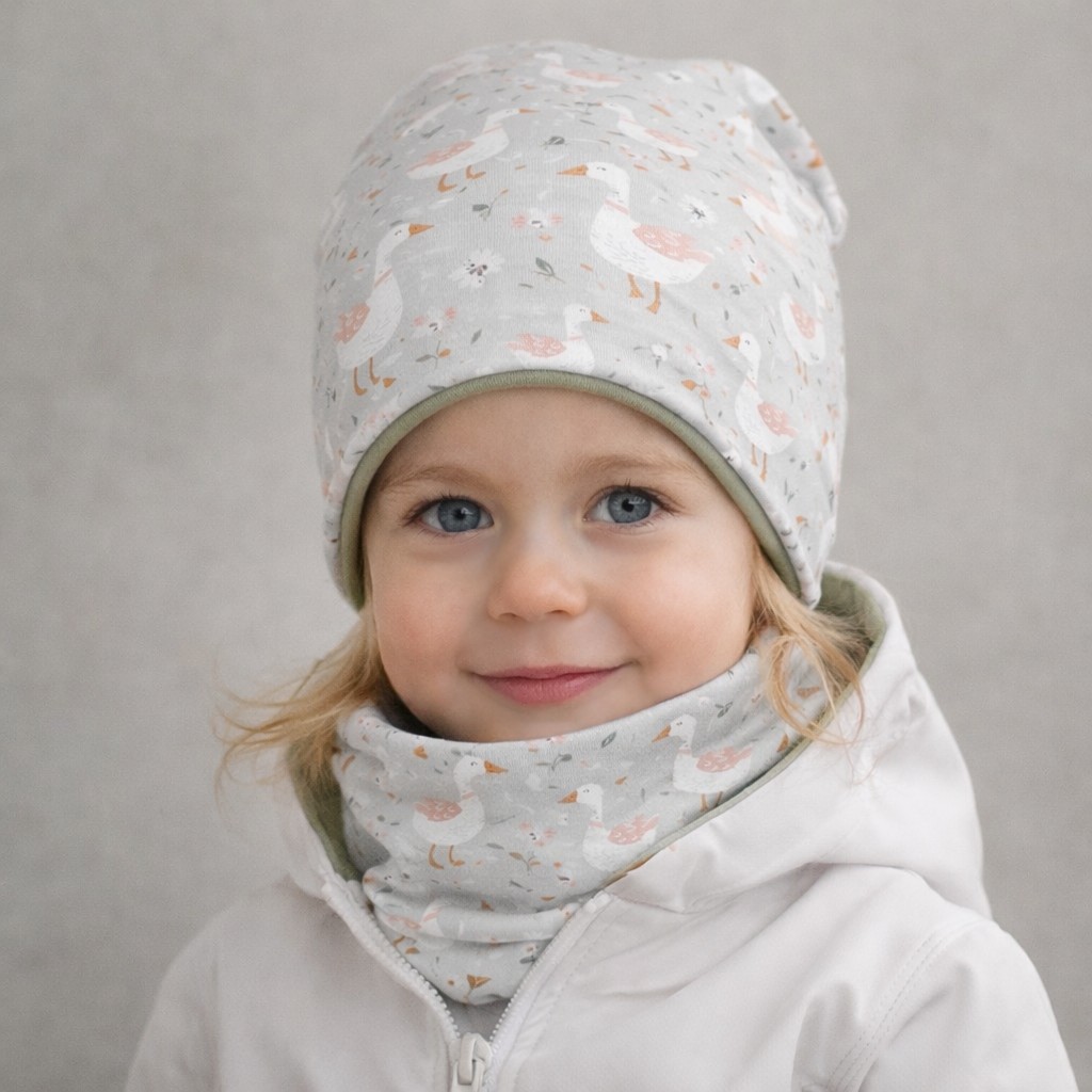 Kifordítható sapka és csősál a hűvösebb napokra, amely kétrétegű kialakításának köszönhetően melegen tart, mégis jól szellőzik. Puha, bőrbarát pamut anyagból készül, nem irritál és egész nap kényelmes viselet.