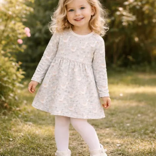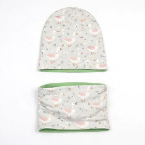 A sapka és a csősál kifordítva is hordható: egyik oldala mintás, a másik egyszínű, így egy szett kétféle megjelenést kínál. A csősálat már a kisebbek is könnyedén fel tudják venni.