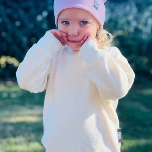 Ez az ekrü színű, kötött pamutból készült gyermek pulóver ideális választás kislányoknak és kisfiúknak egyaránt.