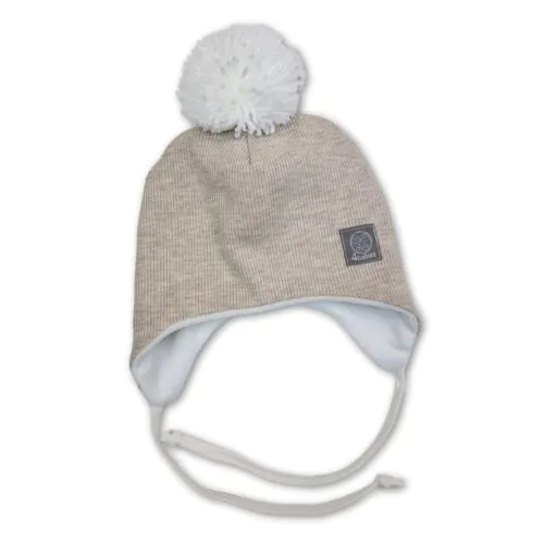 4BABIES Téli kötős babasapka, bordás bézs & fehér pompon