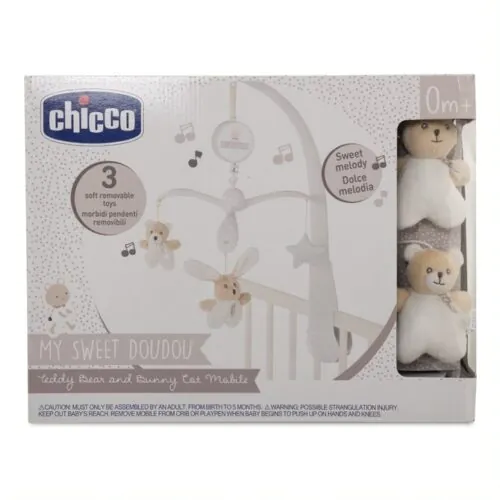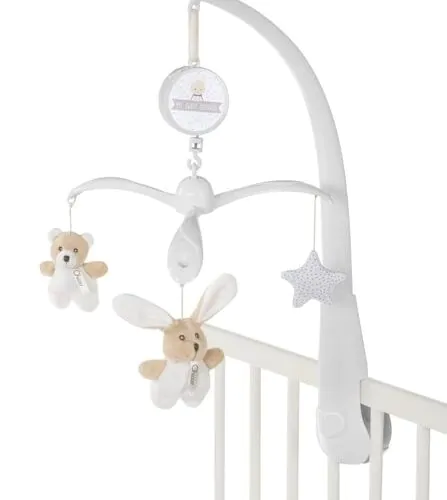 MY SWEET DOUDOU maci & nyuszi forgó egy zenélő-forgó kiságyi zenejáték, 3 puha tapintású plüss figurával, amelyek nyuszi, maci és csillag formájúak. Az ágy peremére szerelve a forgó szórakoztatja a babát a nap folyamán, és édes dallamokkal nyugalmat és pihenést hoz az esti alvás előtt («Lullaby» WA Mozart).