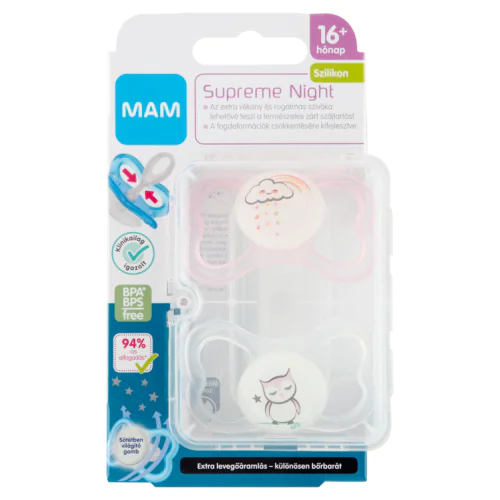 Ráadásul MAM Supreme szívóka nyaka 60%-kal vékonyabb és 4-szer rugalmasabb, mint más cumiké, ezért különösen alkalmasak az egészséges fogak és állkapocs fejlődésének támogatására.