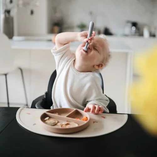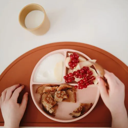 A Mushie csúszásmentes szilikon lapostányér biztosan tapad a felülethez az alján található tapadókoronggal, így gyermeked nem tudja a hajára borítani a spagettit!