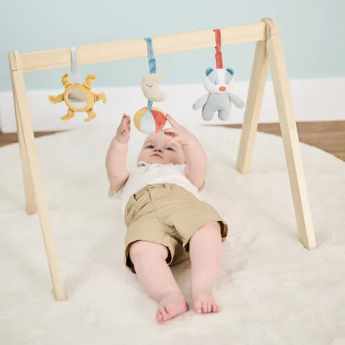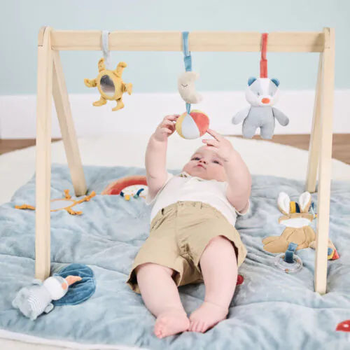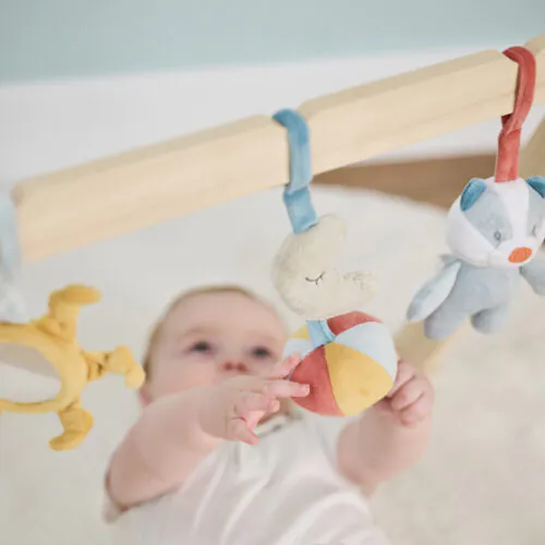 Teremts vidám játszóteret babádnak a Nattou fa babatornásztatójával! Ez az 50×60 cm-es tömörfából készült babatornásztató négy izgalmas tevékenységet kínál, amit babád felfedezhet és megfoghat. Található rajta egy színes napsütés tükörrel, egy plüsslabda csörgővel és egy sípoló, amelyek optimálisan stimulálják a baba fogási reflexeit. Helyezd a játékhidat egy puha felületre, például játszószőnyegre, és kezdődhet a móka! A játékok könnyen eltávolíthatók és mosógépben moshatók.