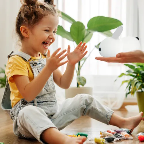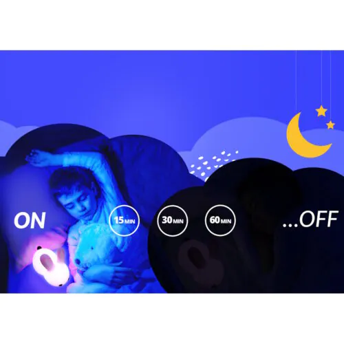 Továbbá, az éjjeli lámpa be van építve időzítővel, így beállíthatod, hogy automatikusan kikapcsoljon 15, 30 vagy 60 perc elteltével, ami tökéletes megoldás lehet, ha a gyermeked nem szeret teljes sötétségben elaludni.
