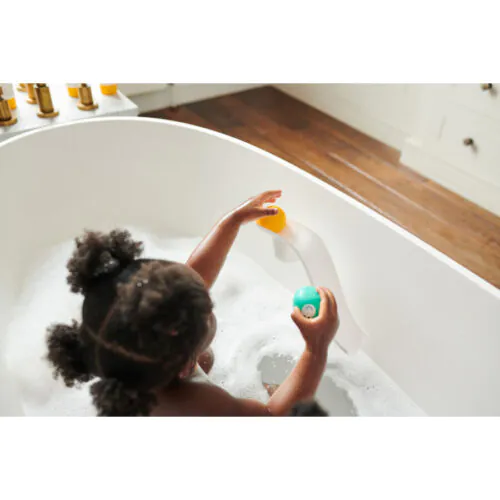 Illesszétek a kád széléhez vagy bármilyen sima felülethez a csúszdát a tapadókorong segítségével, a puha labdák pedig már gurulhatnak is a habokba!