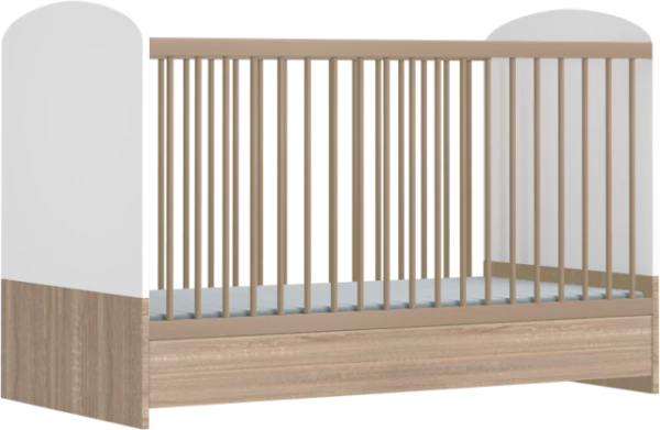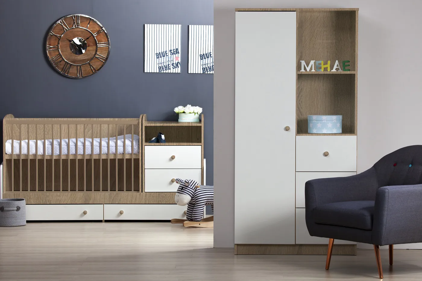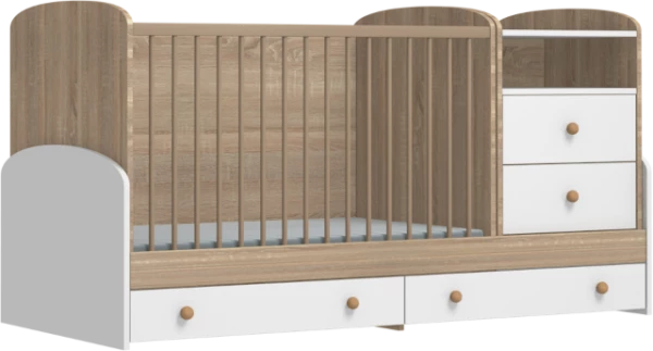 A legsokoldalúbb gyermekágyunk. Amellett, hogy a kezdeti időszakban babaágy és pelenkázó komód egyben, később még ifjúsági ággyá, valamint íróasztallá is alakítható..